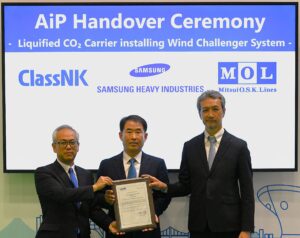 22 April 2026 – ClassNK has issued an Approval in Principle (AiP) for a Liquified CO carrier installing the ‘Wind Challenger,’ a hard sail wind propulsion system. The ship is jointly developed by Mitsui O.S.K. Lines, Ltd. (MOL) and Samsung Heavy Industries Co., Ltd. (SHI). The AiP confirms the feasibility of the ship’s design from the perspective of applicable rules and safety requirements. A certificate handover ceremony was held at Sea Japan 2026.